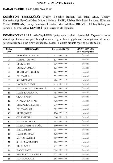 KOMİSYON KARARI 1: 696 Sayılı KHK ‘ye istinaden mahalli idarelerdeki Taşeron İşçilerin sürekli işçi kadrolarına geçirilme işlemleri ile ilgili olarak uygulamalı sınav yöntemi ile sınav gerçekleştirilmiş olup sınav sonucunda başarılı olanlara ait liste aşağıda belirtilmiştir.
